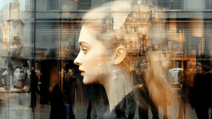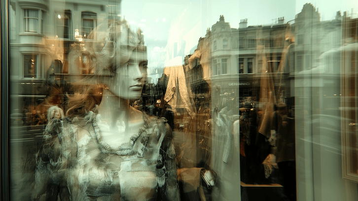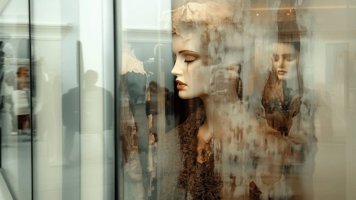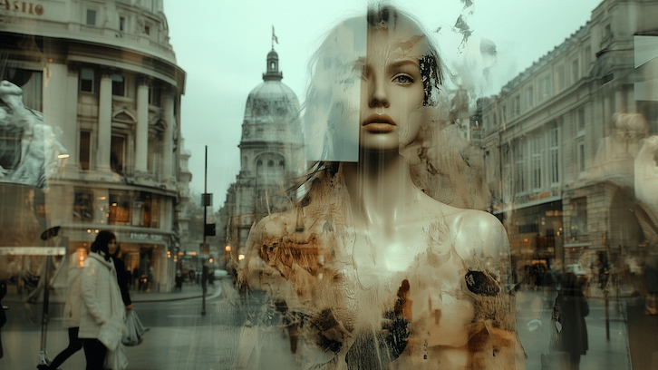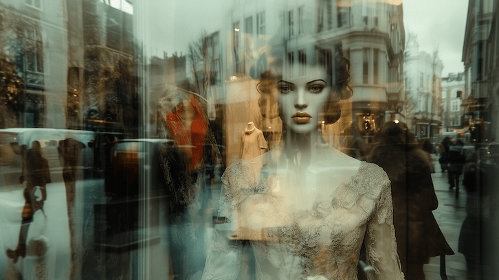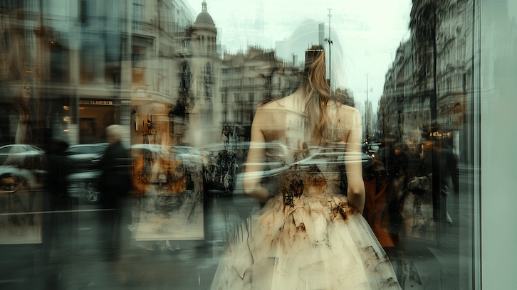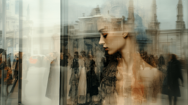..Y por un instante, la luz da vida a lo que no existe y el universo muestra algunos de sus infinitos y precarios matices. Los reflejos y refracciones son los efectos de la luz que juega en nuestra mente y muestra paisajes imaginarios, aunque evidentes: están allí frente a nosotros. Pero son una ilusión. La idea de esta colección es aprovechar el efecto mágico de la luz en las vitrinas comerciales de las grandes ciudades, donde por un momento el tráfico humano y la presencia inanimada de los maniquíes participan, en un abrir y cerrar de ojos, de una nueva realidad.