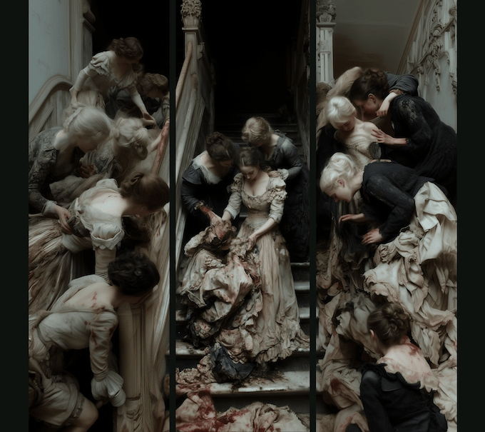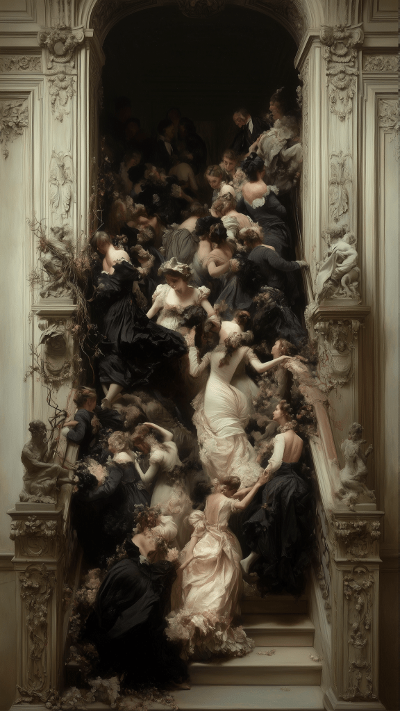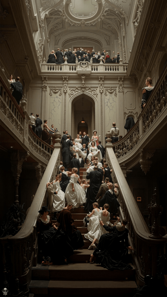 Con mi particular obsesión con el Barroco y sus desbordes, a los que considero su destino como estilo (el colapso de una explosión), vuelvo al tema de las escaleras concurridas. Allí, por la ropa, parecería que los convoca la fiesta, sin embargo, hay en sus gestos y desplazamiento una inquietud, un «algo más» que cada uno podrá imaginar.