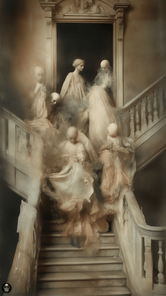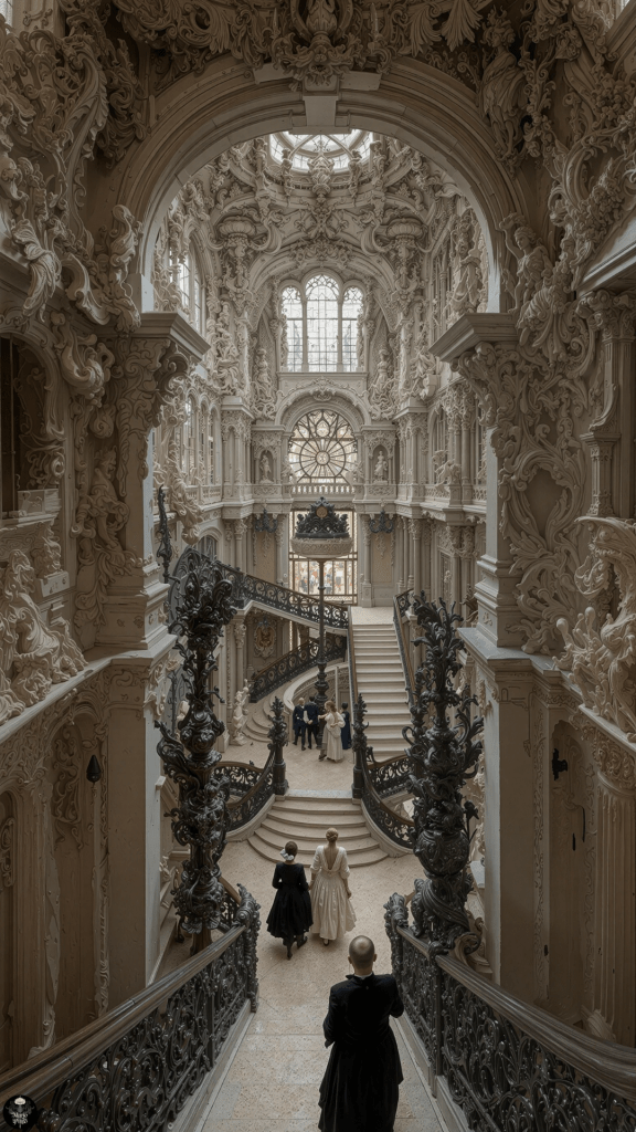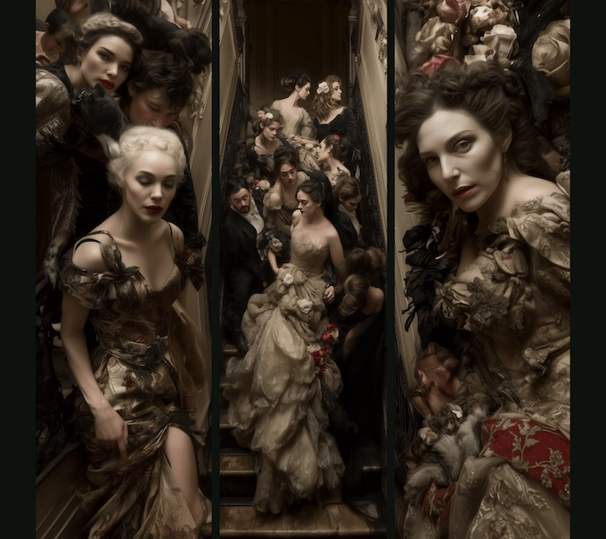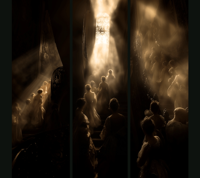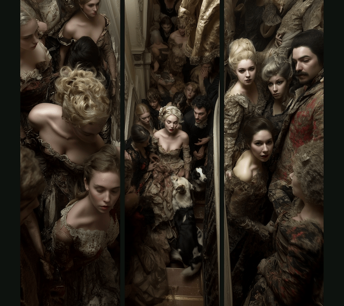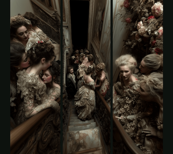 Me atrae el barroco, es un hecho.Más de lo que hubiera reconocido. La exageración, la tensión dramática, la convivencia de lo sagrado y lo profano, el esplendor y la caída. También, como las ventanas, me atraen las escaleras. Jugando con la idea, se produjo esta reunión de una muchedumbre en torno a escaleras palaciegas, donde en los gestos y las miradas se cuentan historias, que tú puedes imaginar a tu gusto.