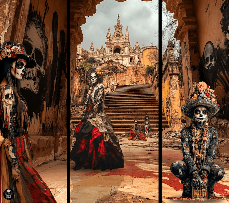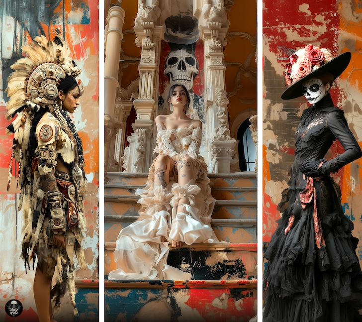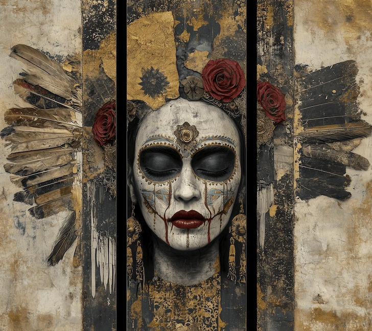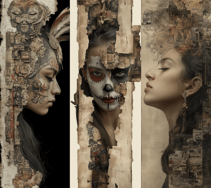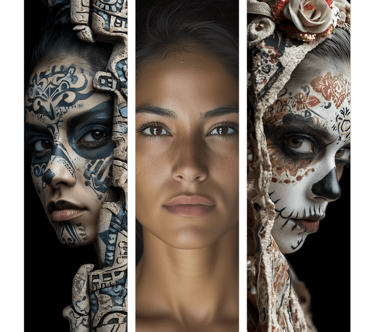 La serie “mexican graffitti” no es nueva, aunque es reciente. En esta serie me dediqué a explorar una de sus ramificaciones: los trípticos dedicados a homenajear a la mujer mexicana. La de ayer, la de hoy, la de siempre. La indígena, la catrina (símbolo de la rica tradición mestiza), la contemporánea.