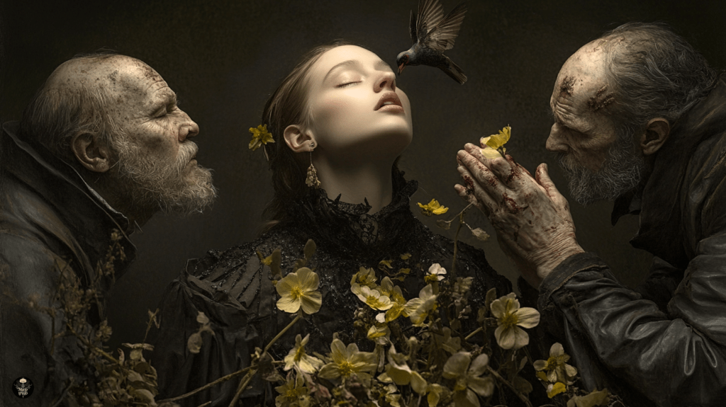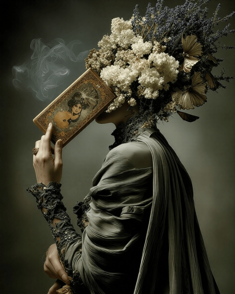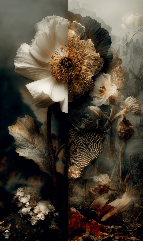 Cada imagen es una flor imposible: tejida de humo, de pétalos que parecen piel, de minerales que recuerdan huesos, de ecos que se disuelven en la penumbra. Son flores que solo existen en la zona donde lo real pierde contorno y el sueño comienza a dibujar su propia lógica.