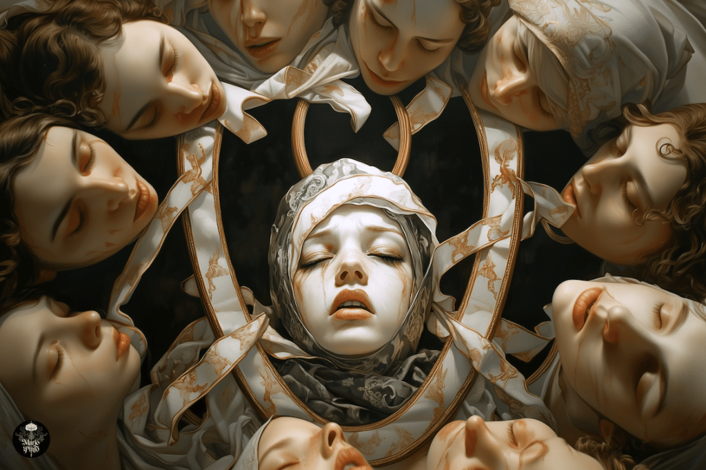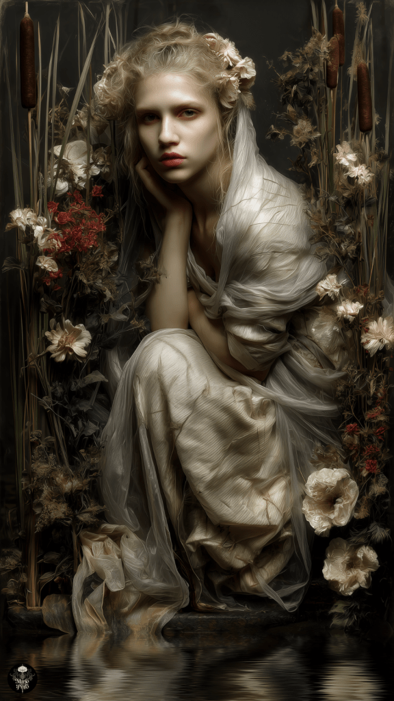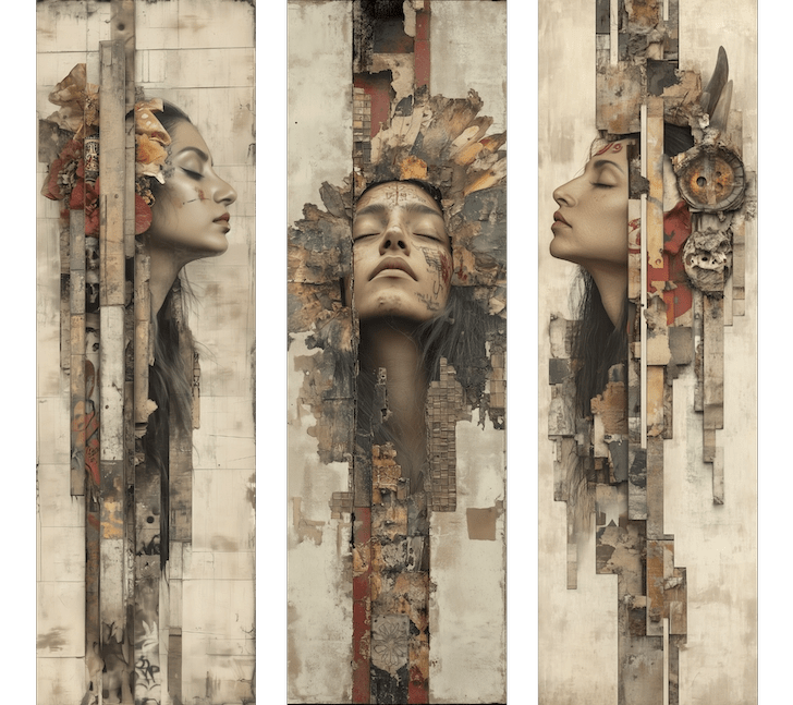Un equilibrio entre lo orgánico, lo mineral, lo humano y lo roto. Estos retratos tienen algo de reliquia antigua y algo de sueño vegetal. Diosas hecha de conchas, piedra y cicatriz, donde lo humano se vuelve fósil, y lo vegetal, herida que decora. La belleza no teme las grietas. Vive en ellas.