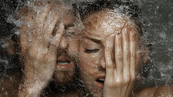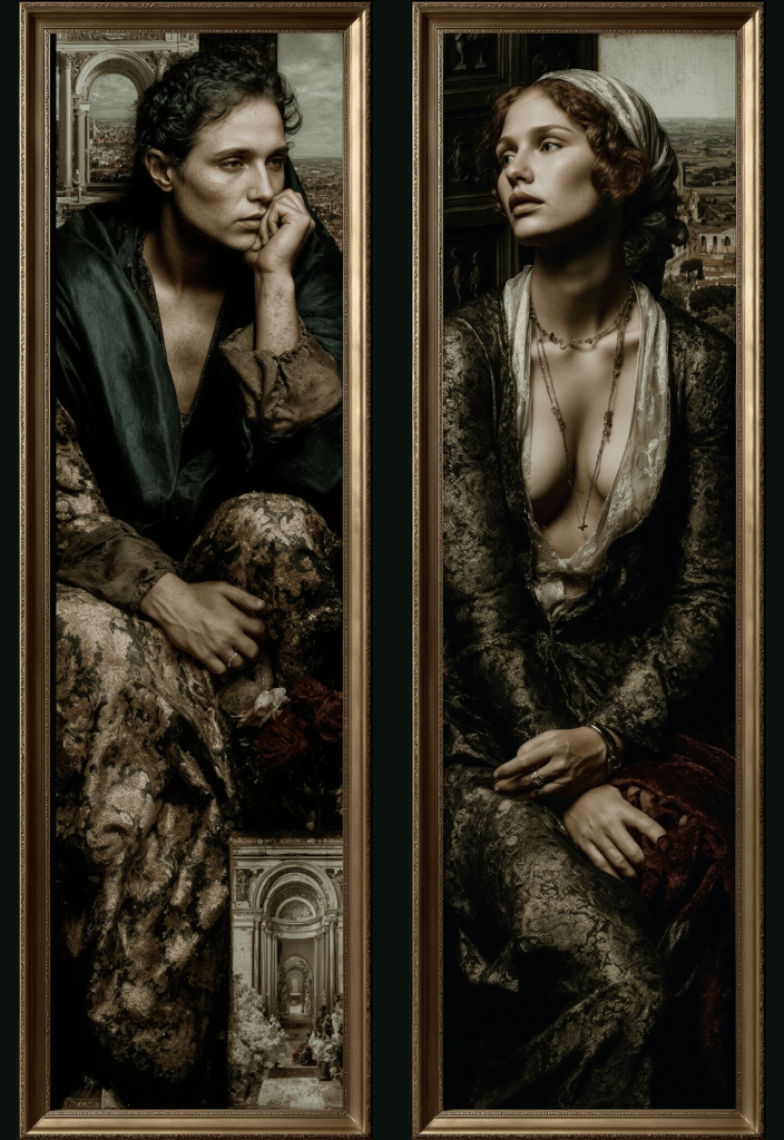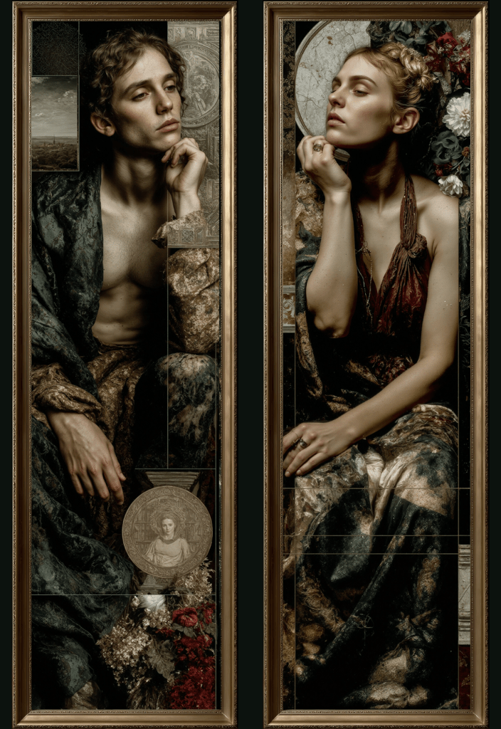 Serie de dípticos en los que la tradición renacentista se reinterpreta como prisión. Un hombre y una mujer ocupan paneles verticales, inclinados hacia el otro, pero condenados al desencuentro por el límite del marco.