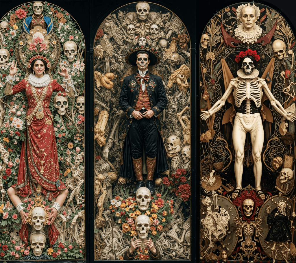 El oro, omnipresente, deja de ser símbolo de riqueza para convertirse en vestigio; la multitud, antes exaltación de vida, ahora anuncia su disolución.