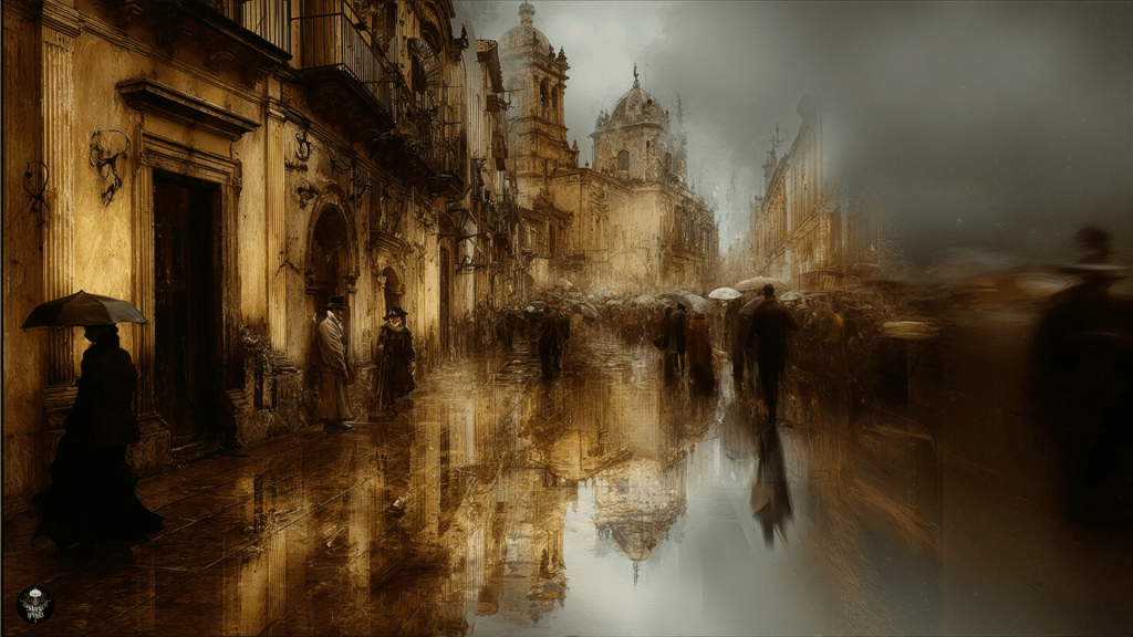 La serie recupera la atmósfera que Borges vislumbró al escribir que la lluvia es siempre algo que sucede en el pasado: una evocación, un recuerdo, un instante que ya ha quedado atrás en el momento mismo de ser vivido. Así, cada calle empedrada, cada farol encendido, cada muro desgastado por el tiempo es atravesado por la lluvia como un velo que difumina lo inmediato y lo transforma en memoria.