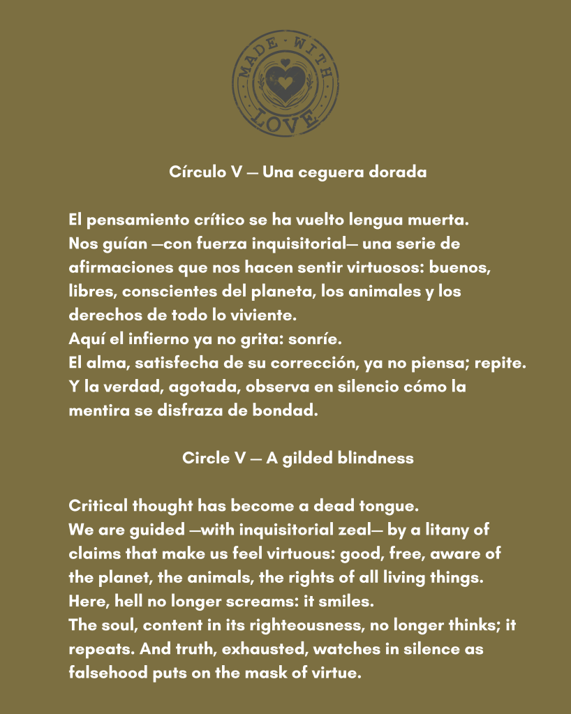 Narcisismo, exceso, ambición, furia, virtud performativa, idolatría, susceptibilidad e indiferencia: los pecados se transforman, pero persisten. Aquí el fuego no arde; deslumbra. Los cuerpos no sufren; posan.