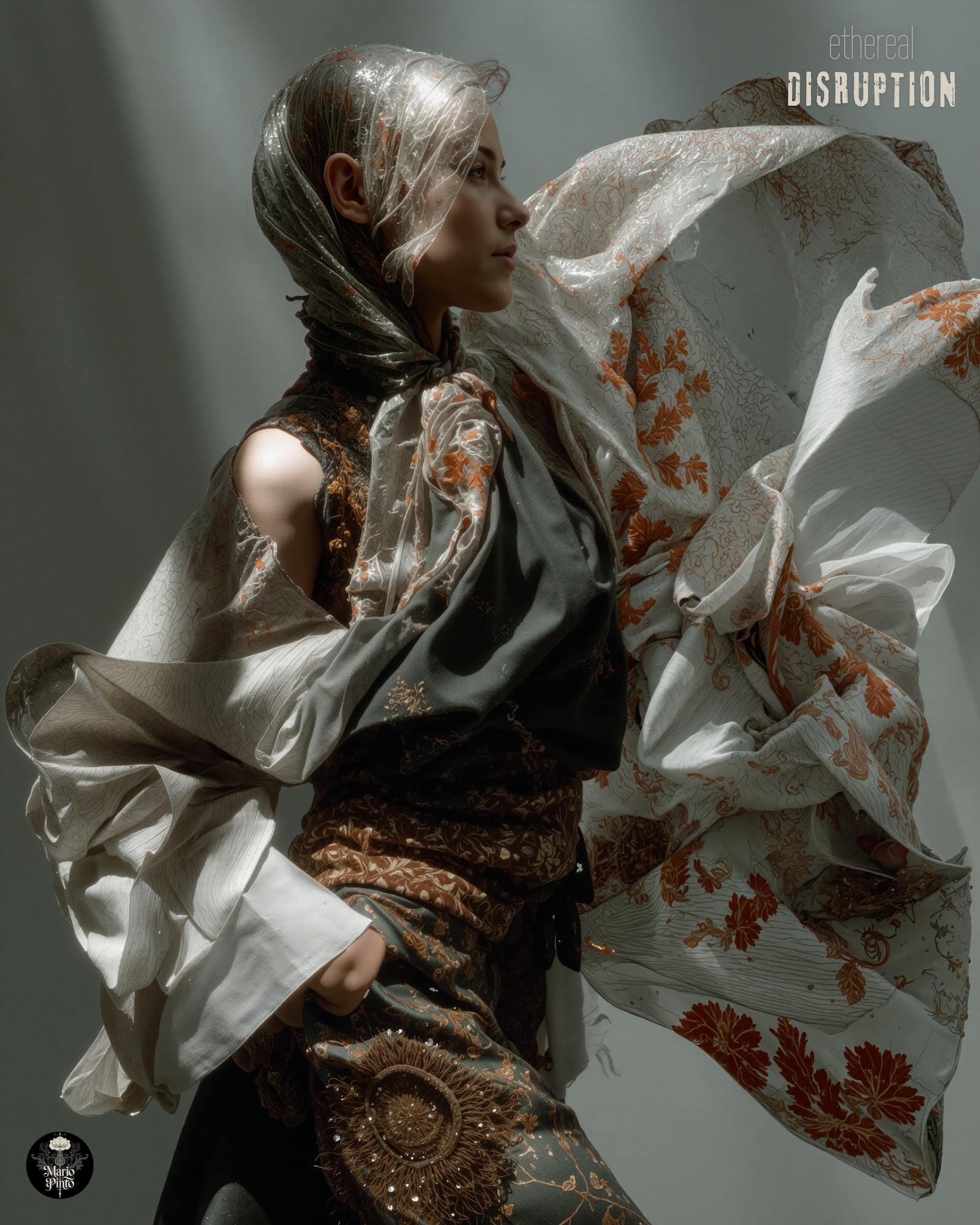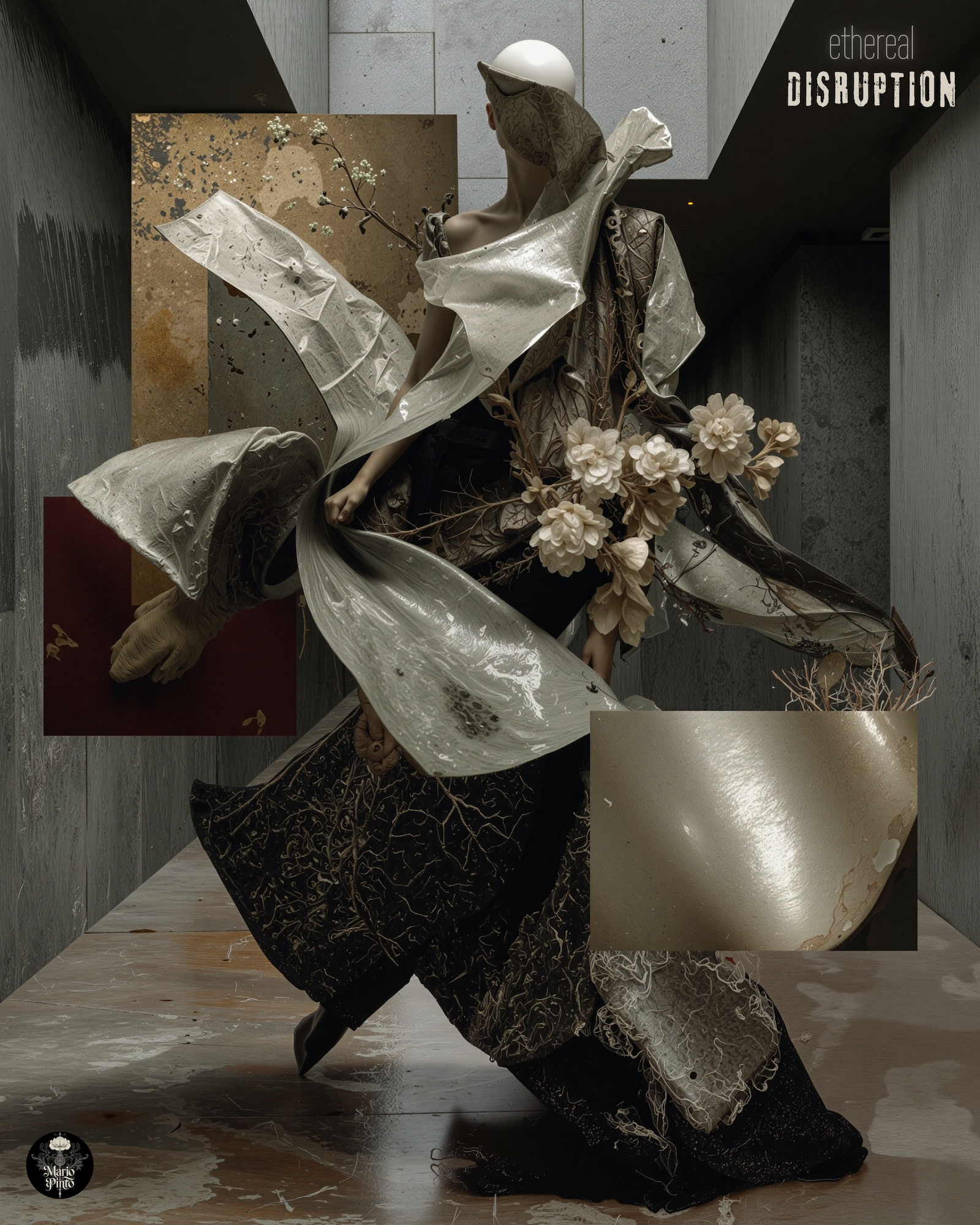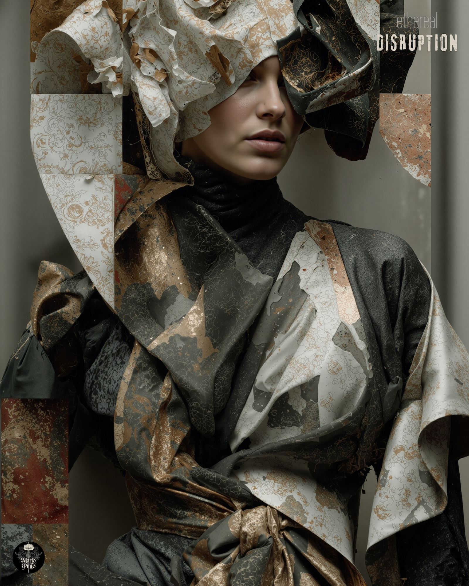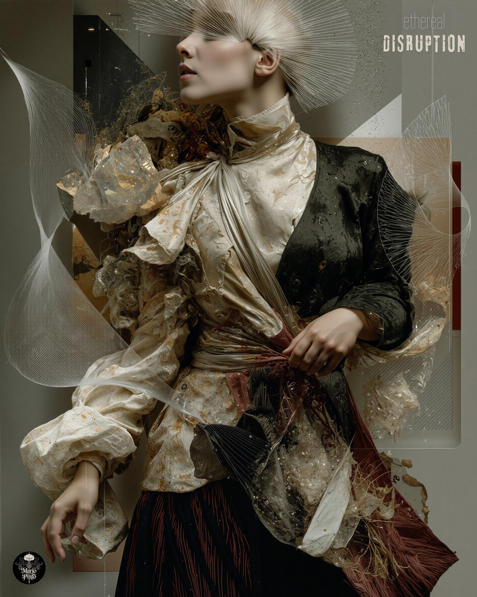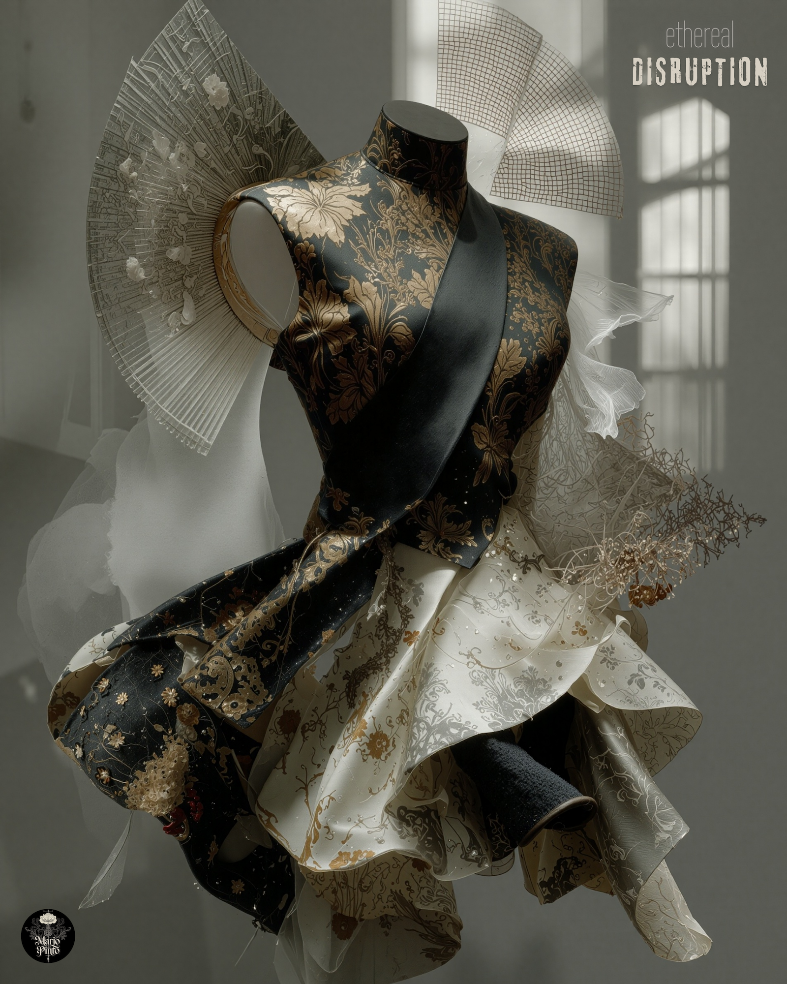 Ethereal Disruption es una colección que juega en el límite entre el diseño de moda y la abstracción artística. Sus siluetas y texturas, al mismo tiempo etéreas y contundentes, desarticulan la idea de prenda funcional para transformarla en un gesto visual. Aquí la innovación convive con lo poético: un territorio lúdico donde la moda se convierte en lenguaje plástico y la abstracción adquiere cuerpo y movimiento